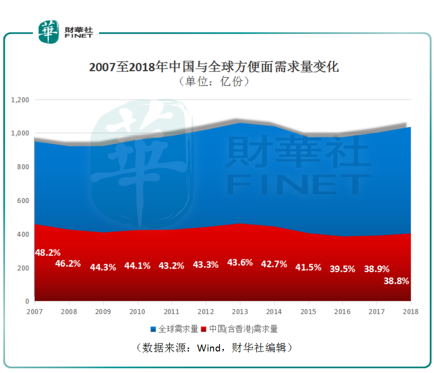 中国市场作为全球方便面需求最大的市场,其趋势与全球市场变动雷同。财华社研究历史数据发现,在2014年与2015年的市场下跌中,中国市场的回落更为明显,而在之后的复苏力度却逊于全球市场。这使得中国方便面需求量占全球需求量的比重由2007年的48.2%下降至2018年的38.8%。财华社在研究中国方便面行业数据时也发现一个奇怪的现象,2018年销量复苏的中国市场产量却在大幅下滑,这很不合常理。