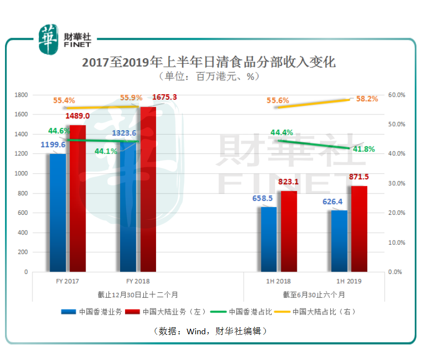 日清食品的母公司虽是全球最大的即食面生产及销售商,但是其聚焦的主要是方便面高端消费市场,在中国方便面整体市场的占比也远不及前两位。尽管如此,日清食品似乎没有降低国内产量或产能的动力。该公司于2017年12月在港交所上市,现金充足。截止2019年6月30止六个月,公司在中国大陆地区与香港地区的收入占比分别为58.2%及41.8%,中国大陆地区的收入占比呈现逐渐走高趋势。