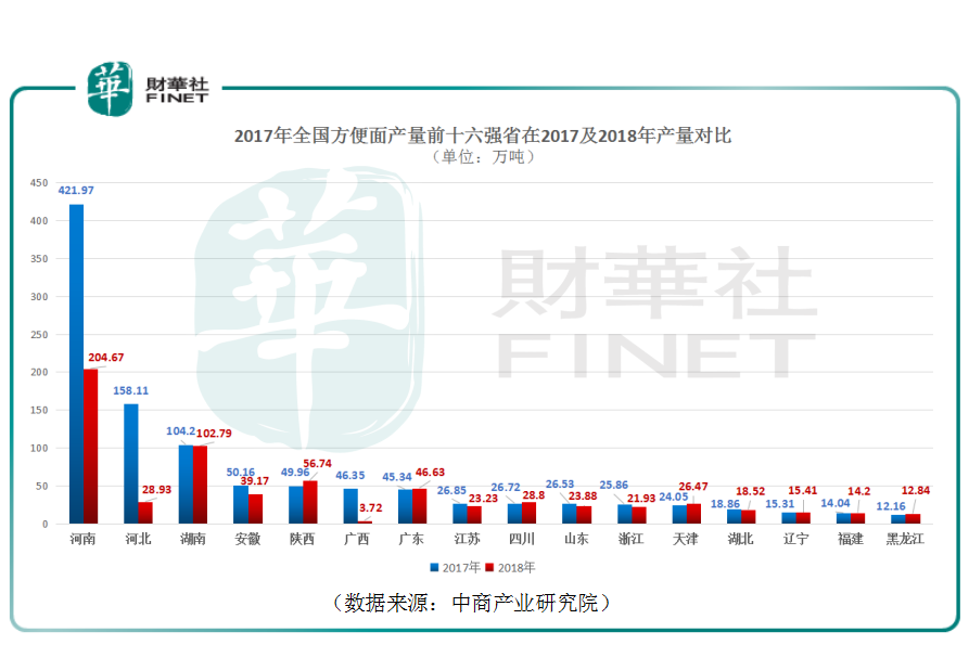 财华社统计了2017年全国方便面产量前十六强省及直辖市在2017年及2018年产量的变动。从下图可以发现,排名全国方便面产量第一的河南省,2017年的方便面产量为421.97万吨,2018年跌至204.67万吨,较上年大降51.5%。河北省2017年产量排名全国第二,为158.11万吨,2018年降至28.93万吨,降幅高达81.7%。