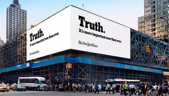 最近有不少美国主流媒体,尤其是纸媒,常常推出大规模的品牌宣传。譬如《纽约时报》在2017、2018年陆续推出以“真相”“调查报道”为主题的品牌广告,“我们认为这是一种令人信服的方式,用来展示媒体人的工作。”《纽约时报》负责品牌和读者的的高级副总裁David Rubin说。