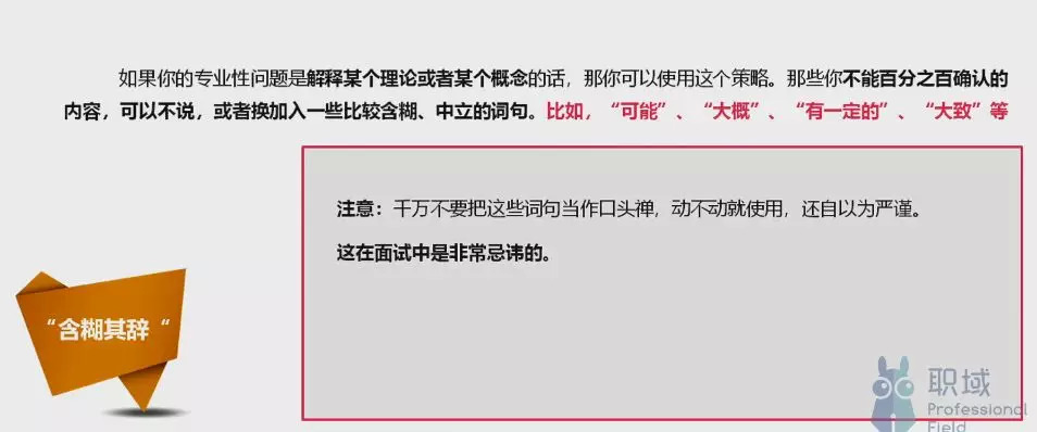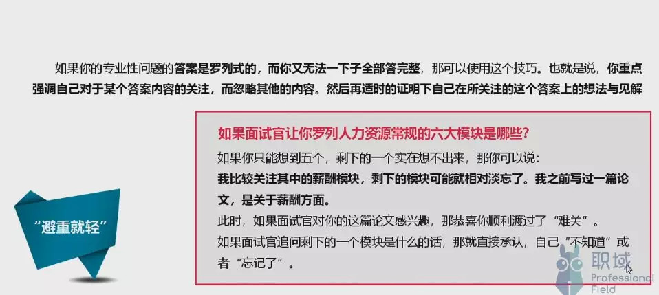 最后,再来总结一下:重点不是“会不会”,而是要扬长避短。如果问到知识类的问题,不会就说不会;问的是专业技能类问题,但是不知细节,可以说自己的大概思路,或转移问题到自己会的领域。