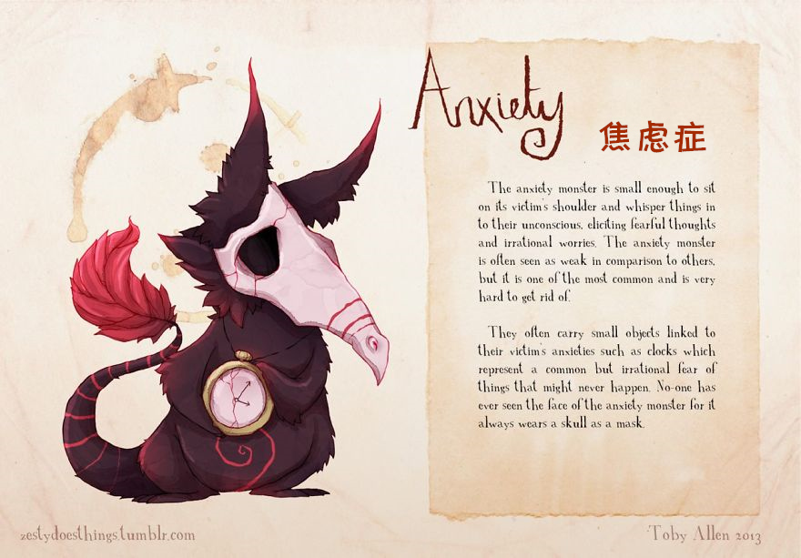 焦虑症是一只很小的怪兽,小到能坐在你的肩上,对着你内心的恐惧与担忧轻轻耳语。跟其他的心理疾病怪兽相比,焦虑症看起来很弱小。但它是最常见,也最缠人的。你很难摆脱它。