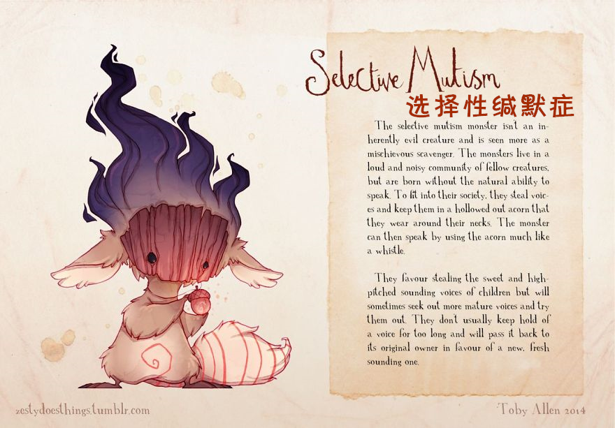 这只怪兽不是生来邪恶的,它更像是一个顽皮的拾荒者。选择性缄默症跟它的同类一起居住在一个吵闹的社区里,但它生来没有说话的能力。为了融入环境,它会从别人身上偷取声音。偷来的声音藏在它挂在脖子前的橡果里,之后它就能像吹口哨一样说话了。