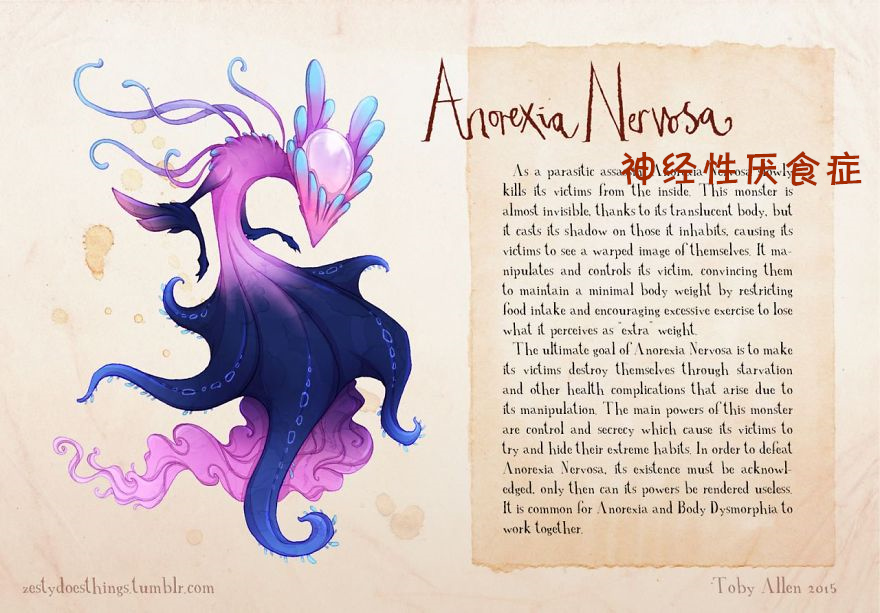 神经性厌食症就像是寄生在你身体里的刺客,会神不知鬼不觉地将你杀死。因为有着半透明的身体,这只怪兽几乎是肉眼看不见的。但它会把自己的影子投在寄主的身上,让他们觉得自己看起来很扭曲。它会说服你保持轻盈体态,让你控制饮食,做过量的运动,来减掉所谓“过多的”体重。