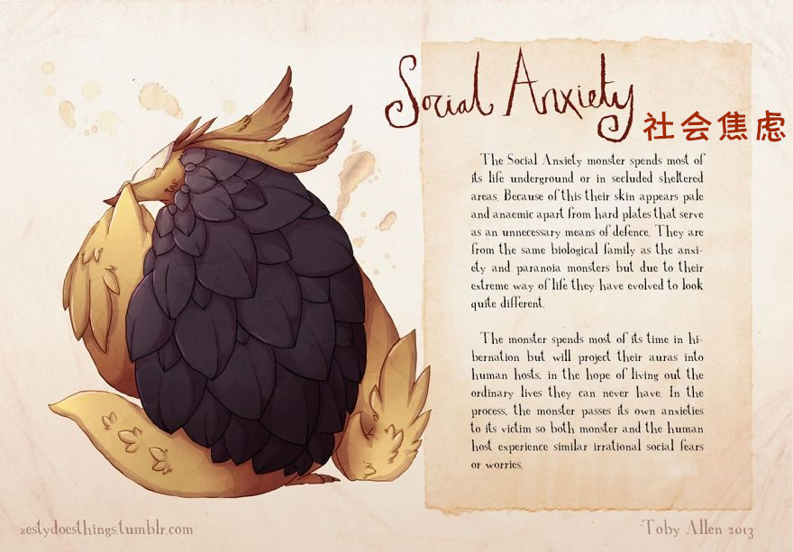 社会焦虑怪兽常常选择躲在地下,或是隐秘的、有遮蔽的地方。除了表面自卫的甲壳外,它的皮肤显得苍白无血色。社会焦虑怪兽跟焦虑症、偏执狂怪兽其实来自同一个家族,但由于它的生活方式过于极端,它进化得与别不同。
