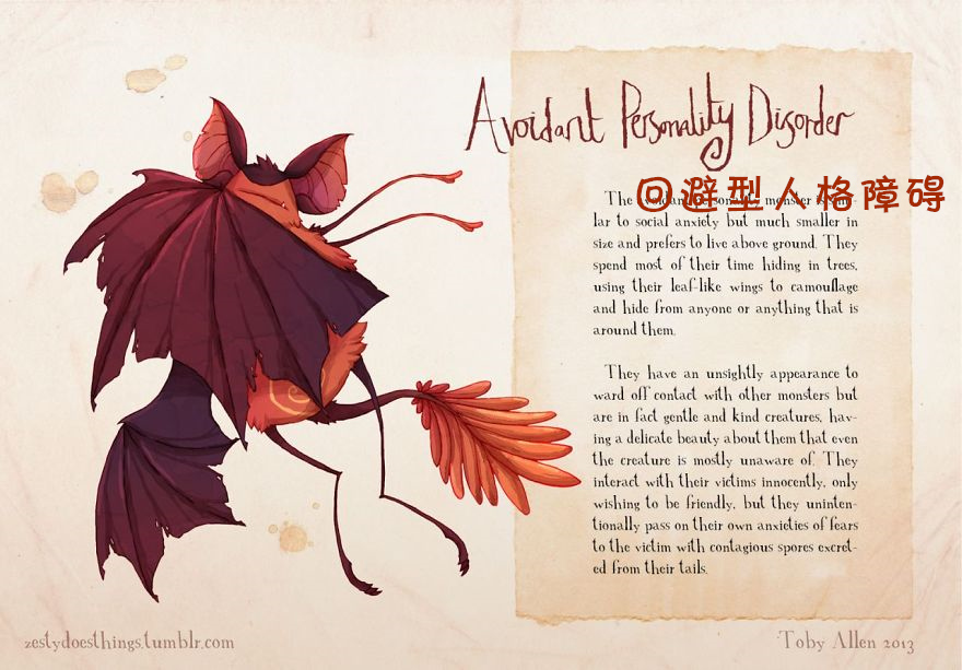 它长得很丑,因为这样,它避开了跟其他怪兽之间的接触。但其实回避型人格障碍很温柔,而且心地善良。它不带恶意,只是想跟你做个朋友。但它无意中摆动的尾巴释放了可传染的负能量孢子,一不小心,你就感染上它的焦虑和恐惧了。