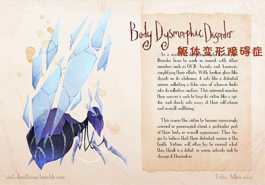 躯体变形障碍症简直就是欺骗大师,它最喜欢跟强迫症、焦虑症以及神经性厌食症等怪兽一起行动。它的腹部有像玻璃碎片一样的鳞片,看起来就像是一面支离破碎的镜子。任何人站在这前面,都会看到扭曲的、不真实的自己。这只怪兽还会像蜘蛛一样织网缠住你,慢慢地蚕食你的自尊心和健康。