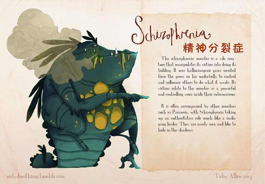 精神分裂症是很卑鄙的怪兽,它会控制你,让你完全听从命令。它的下腹部能释放迷幻气体,它的声音于是潜进你的潜意识中把控一切。