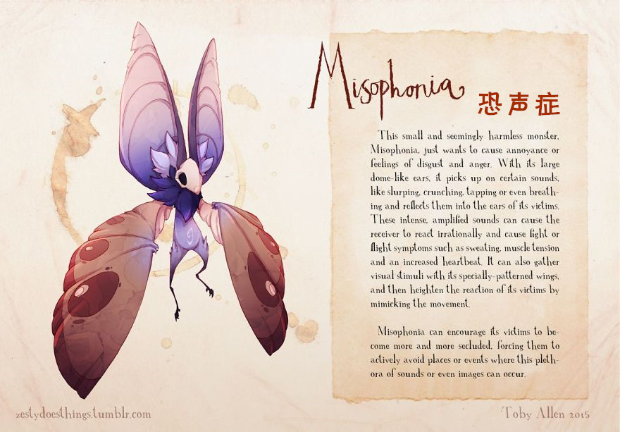 这只看起来瘦小无害的怪兽,会让你觉得困扰、恶心甚至愤怒。它的一双大耳朵可以采集特定的声音传送到你的耳里,例如吃东西时叭吱叭吱的声响、咀嚼的声音、敲门声,甚至是呼吸声。这些经过放大加强的声音,会让你出汗、肌肉紧张,甚至心跳加快。它还可以用翅膀收集相关的画面,以模仿行为来刺激你,从而得到更强烈的反应。