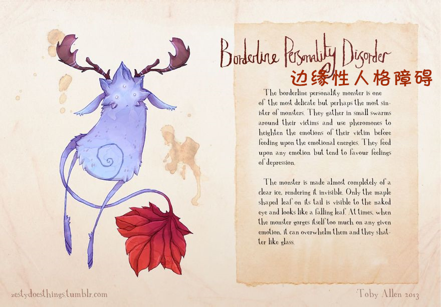 边缘性人格障碍是最美也最恶毒的怪兽。它们会成群地围在你身边,用信息素放大你的一切情绪。它们以你的情绪为食,尤其偏爱抑郁的滋味。