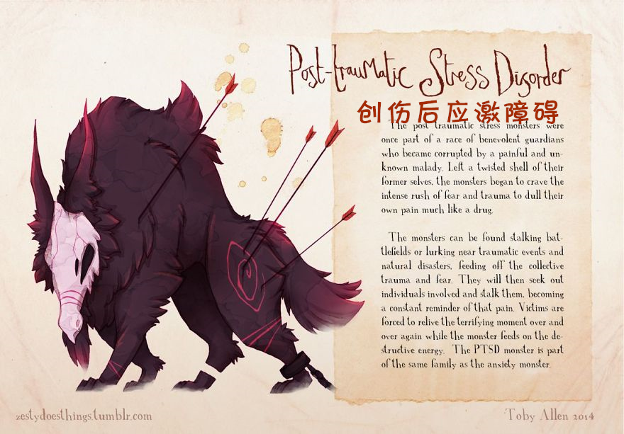 这种怪兽常常埋伏在战场、自然灾难现场等让人震撼心碎的地方,贪婪地享用人们的创伤。它还会跟踪经历现场的人,一直不断地提醒他们这场伤痛。人们一次次艰难地抚平伤疤,而这只怪兽一直以这种毁灭性的能量为食。它跟焦虑症怪兽来自同一个家族。