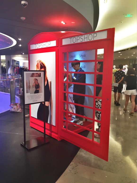 比如在预览当晚,店铺旁边出现了一个红色电话亭,里面装有自拍设备,可以为人和电话亭墙壁上的Topshop和老佛爷百货的字样留影。这个体验虽然是临时性的,但从多数消费者都自愿争相尝试的情形可以看出,有趣的零售店辅助陈设对于调动消费者对品牌的积极性还是很有帮助,尤其是这些照片很有可能会在微信、微博等社交媒体上传播。