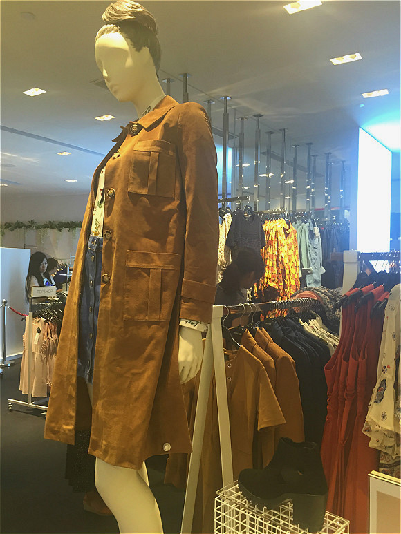 这件羊毛毡质感的外套,被放置在店面最显眼的位置。售价是3120元。Topshop英国网站的售价是250英镑,约合人民币2467元。天猫无此款。
