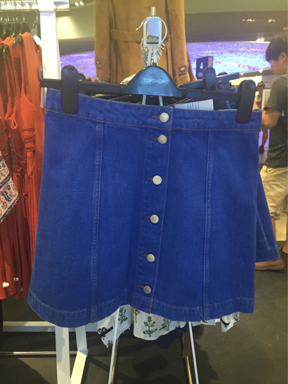 鞋子价格多在250元-450元之间,牛仔裤多在400元左右,吊带、打底衫、T恤多在100-200元之间,均略高于英国官网价格。 而下图中的蓝色牛仔裙几乎被抢空,卖240元左右。