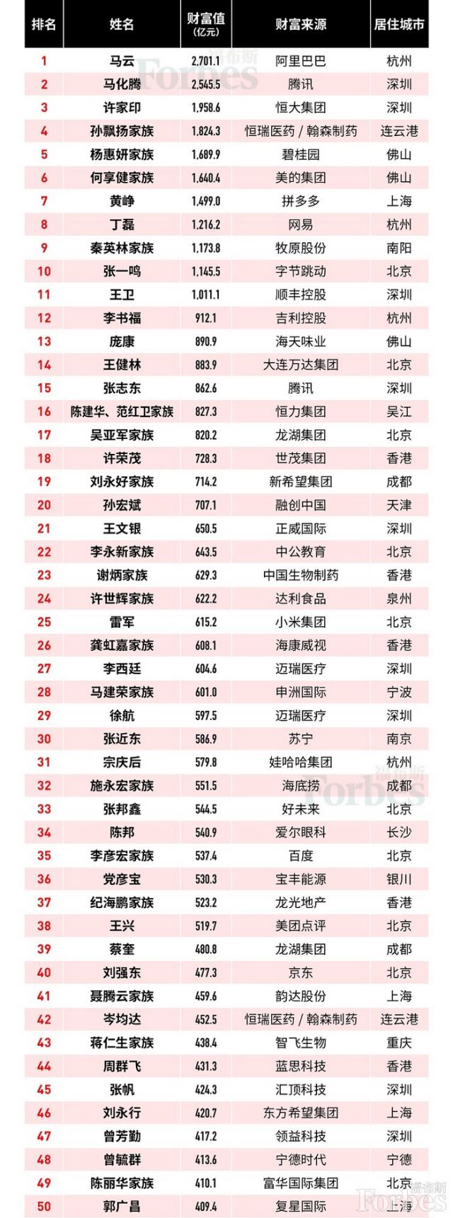 榜单显示,不久前宣告退休的马云蝉联榜首,身家为2701.1亿元;腾讯CEO马化腾紧随其后,身家为2545.5亿元; 恒大集团董事局主席许家印排名第3位,身家为1958.6亿元。