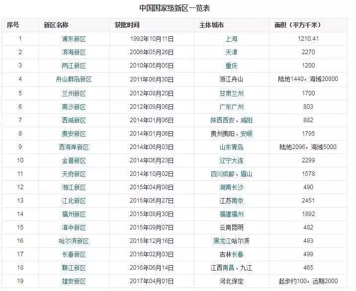 截至2017年4月1日雄安新区成立,中国目前已有19个国家级新区。