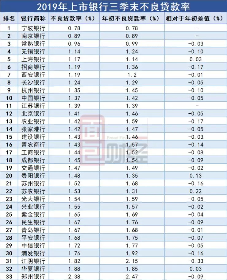 数据显示,截至2019年三季末,多数上市银行不良贷款率较年初出现下降,3家上市银行不良贷款率较年初保持不变,4家银行出现上升。