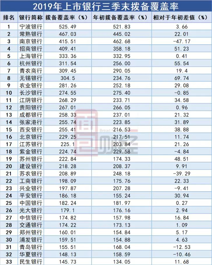 截至2019年三季末,拨备覆盖率较高的前5家银行为别是:宁波银行(525.49%)、常熟银行(467.03%)、南京银行(415.51%)、招商银行(409.41%)、上海银行(333.36%)。