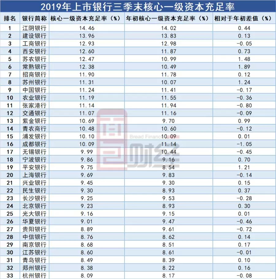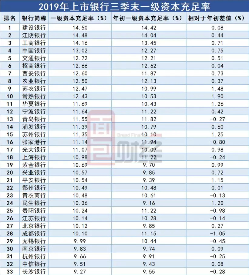 截至2019年三季末,核心一级资本充足率较高的前5家银行为别是:江阴银行(14.46%)、建设银行(13.96%)、工商银行(12.93%)、西安银行(12.60%)、苏农银行(12.47%)。