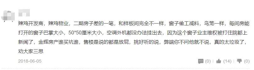 有媒体爆料,四季金辉项目在2015年销售一期项目,价格在6500元/㎡左右,当二期房源销售时,房价已经攀升至13000元/㎡左右,但是当二期房源交付后,业主发现窗户和一期相比小了许多,只有上面的部分能打开,大小在50x50厘米,下面的窗户无法打开,业主甚至比作其为"监狱窗"、"鸟笼"。