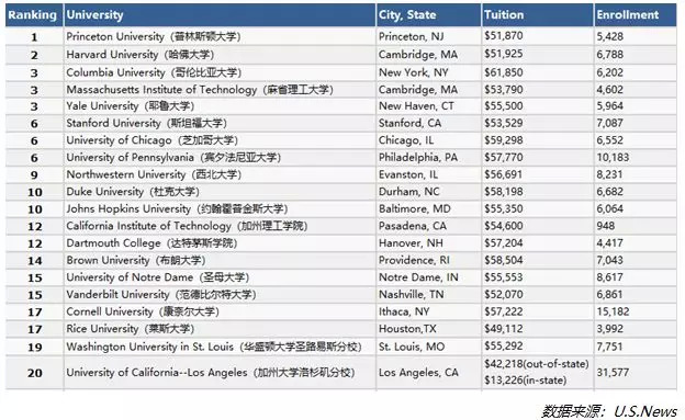 上表还包含了上榜学校所在地区、每年学费(其中公立院校会对本州学生和非本州学生实行不同的收费标准)及注册学生人数。该排名知名度较高,影响力较大,一直是美国学生、家长和中学教师的升学重要参考。每年还有一些其他机构如泰晤士报等会有不同侧重点的排名发布,可以与U.S.News排名相结合,帮助学生全面衡量学校各方面的综合实力。中国留学生选择学校时,可以把学校排名作为一个参考指标。