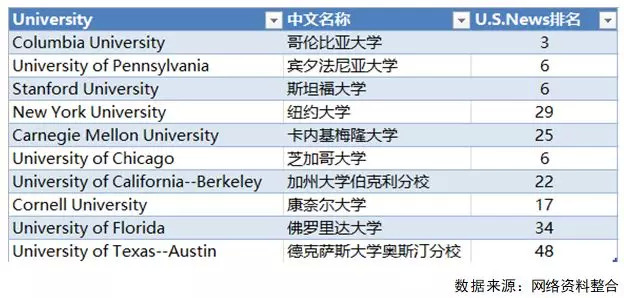 虽然大部分院校都是排名上的顶尖名校,但其中,也有如德克萨斯大学奥斯汀分校和佛罗里达大学等在U.S.News的综合排名并不在Top30,而这些学校即使综合排名不高,但学校的商学院都被业界广泛认可,在求职时,企业也会为这些院校的学生提供更多的面试机会,比如校园内部的网申通道等。