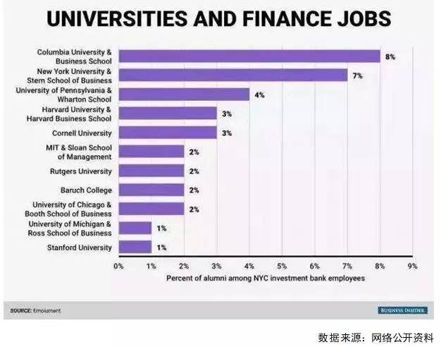 以金融专业为例,毕业生们都想进入金融行业的知名企业,据调查显示,在纽约金融行业工作的精英中,大部分人曾就读于以下11所学校的商学院:哥伦比亚大学、纽约大学、宾夕法尼亚大学、哈佛大学、康奈尔大学、麻省理工大学、罗格斯大学、巴鲁克学院、芝加哥大学、密歇根大学以及斯坦福大学。