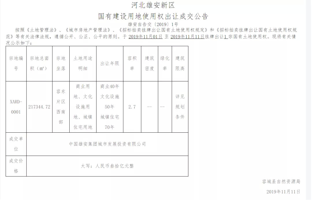 11月11日,雄安新区设立以来第一宗招拍挂土地顺利出让,中国雄安集团城市发展投资有限公司成功抢得“头啖汤”,成交价30亿元,楼面价约3371元/平方米。
