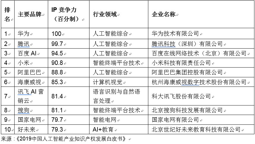 《2019中国人工智能企业知识产权竞争力百强榜》从企业的综合强度、创新能力和技术成熟度三个维度进行定量评比,对500余家中国人工智能主流企业进行定量评估,评选出2019人工智能知识产权竞争力百强企业。其中,十强企业分别是:华为、腾讯、百度、小米、阿里巴巴、海康威视、科大讯飞、搜狗、国家电网和好未来。