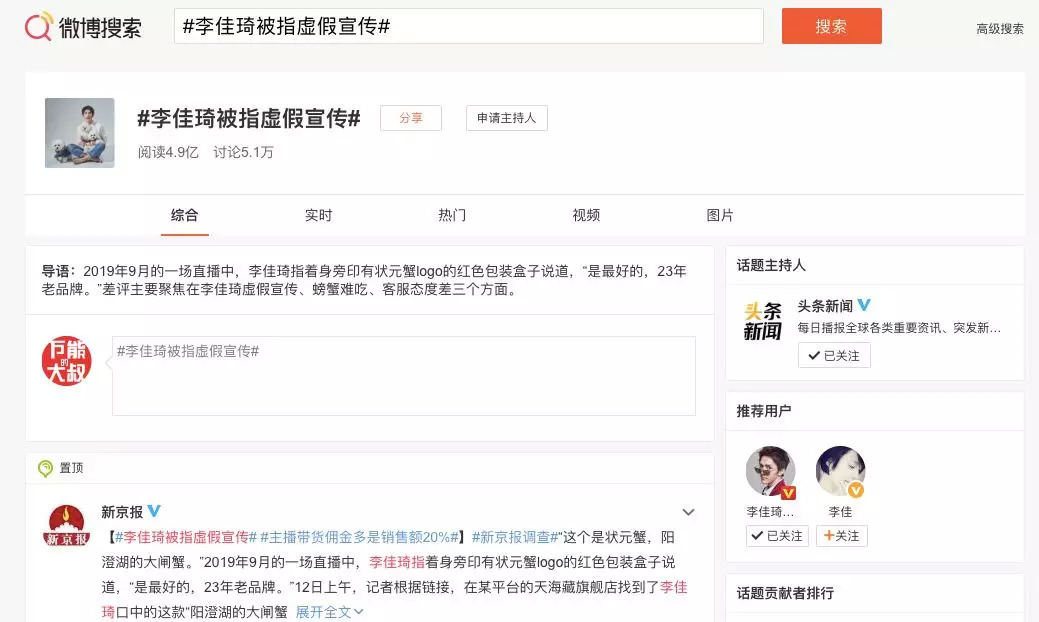 这是一篇始发《新京报》的原创报道,话题#李佳琦被指虚假宣传#是报社自己加的,话题主持人呢,是微博旗下自己的账号@头条新闻,这就说明,一切的操作都是按照新闻热点的角度出发的,而这不是百雀羚,一个企业能左右的。