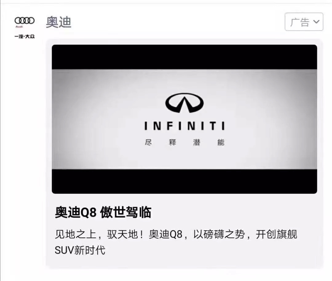 今天还有一个赢家,就是腾讯广告,奥迪的朋友圈广告位播出了英菲尼迪的内容,竟然还推送了一些人。