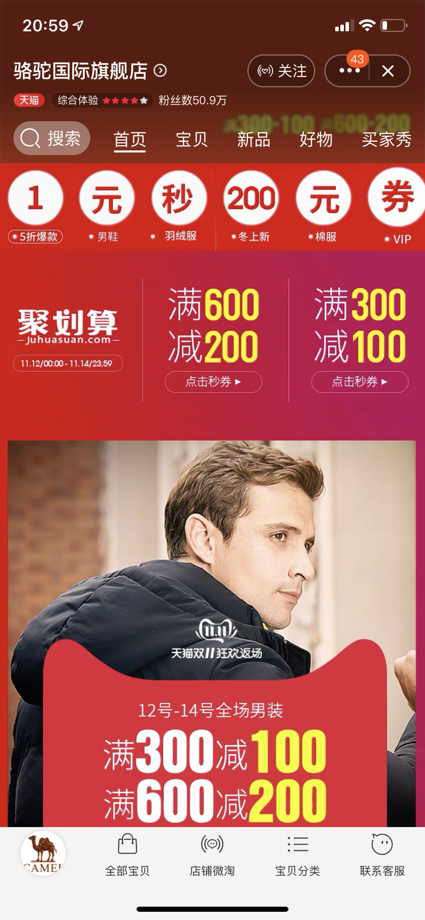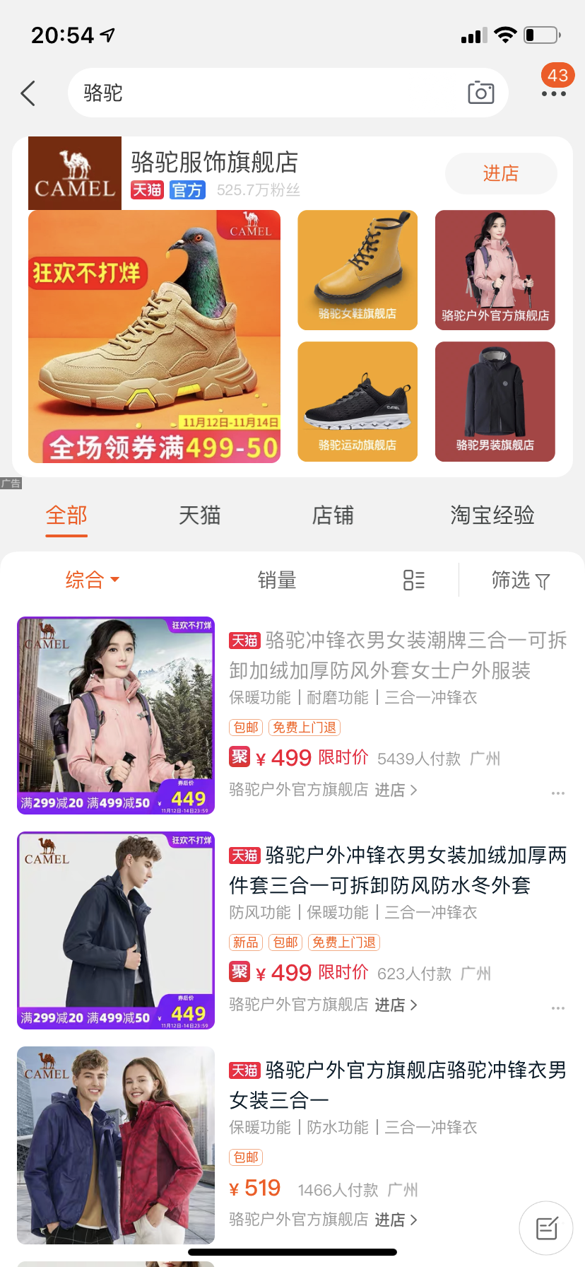 界面新闻在天猫搜索“骆驼”,排名靠前的为“骆驼服饰旗舰店”和“骆驼户外官方旗舰店”,店铺粉丝数分别为525万和348万,两家店铺拥有的营业执照对应的公司为广州喜马拉雅户外用品有限公司,是骆驼(中国)户外用品有限公司的全资子公司,法定代表人均为万光阳。