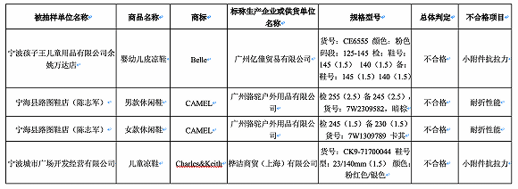 宁波市市场监督管理局日前通报了2019年流通领域鞋类商品质量抽检情况。抽检的45批次鞋类商品中,共发现4批次不合格,皆为知名品牌,包括百丽(Belle)、Charles&Keith和骆驼(CAMEL)。