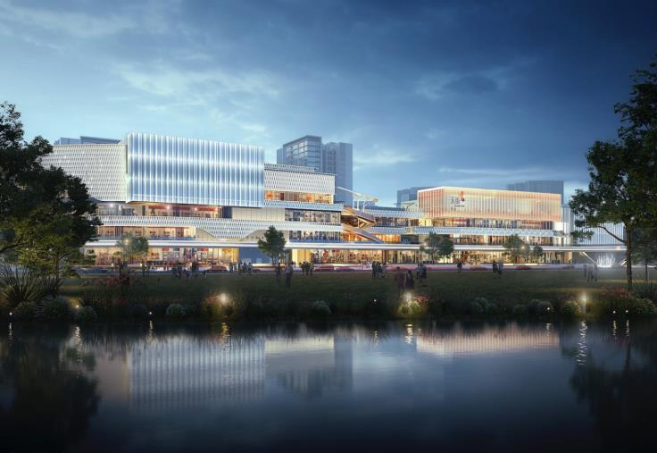 从最新的项目效果图上,我们发现了礼嘉天街非常独到的「先天优势」:与生态资源的结合度非常高,且属于重庆罕见的滨水商业集群。