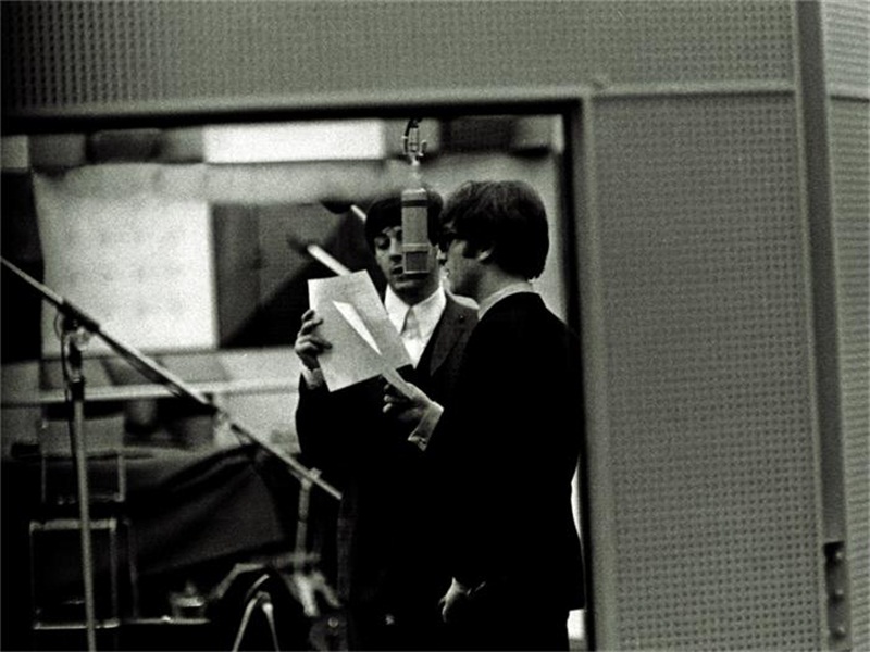 6.Starr称自己很幸运,能够捕捉到一些珍贵的画面,如下图麦科特尼和列侬正在录制歌曲。