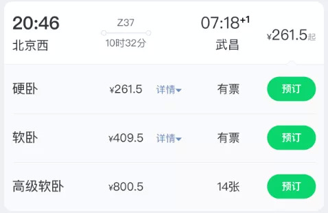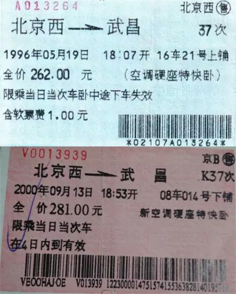 比如,从1996年到2019年,23年里,北京西到武昌的37次列车,从没有字母打头,到K、Z打头,速度越来越快,但票价却始终保持不变。拿硬卧来说,一直都在260元左右。