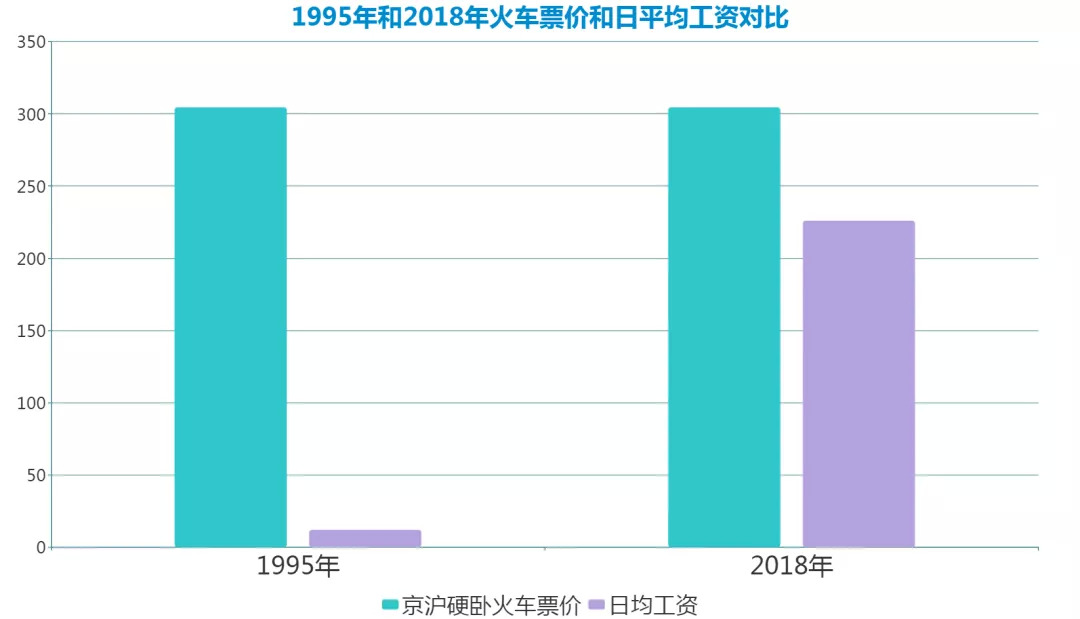 一个可供对比的维度是工资收入。以京沪特快硬卧火车票为例,20多年来基本维持在304.5元。