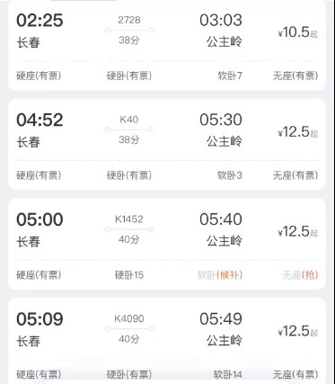 长春到公主岭的火车票大多是12.5元,最便宜的夜班车只要10.5元。