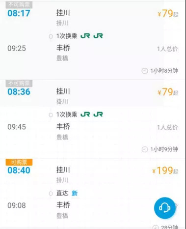 日本挂川到丰桥,最便宜票价79元,最贵的199元。