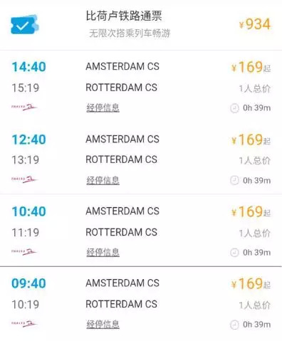 荷兰阿姆斯特丹到鹿特丹,火车票售价为169元。