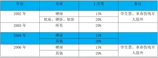 (2002、2003、2004及2006年春运期间实行的火车票浮动标准)