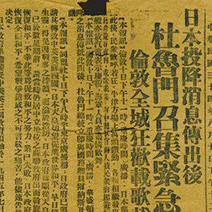 日本投降,中国举国欢腾,老报纸记录云:“马路上到处挤满了市民,一阵阵锣鼓的声音,一队队火炬游行的队伍,愈来愈增加了狂欢,号外的声音也传来了,价钱高到一百元一张。”