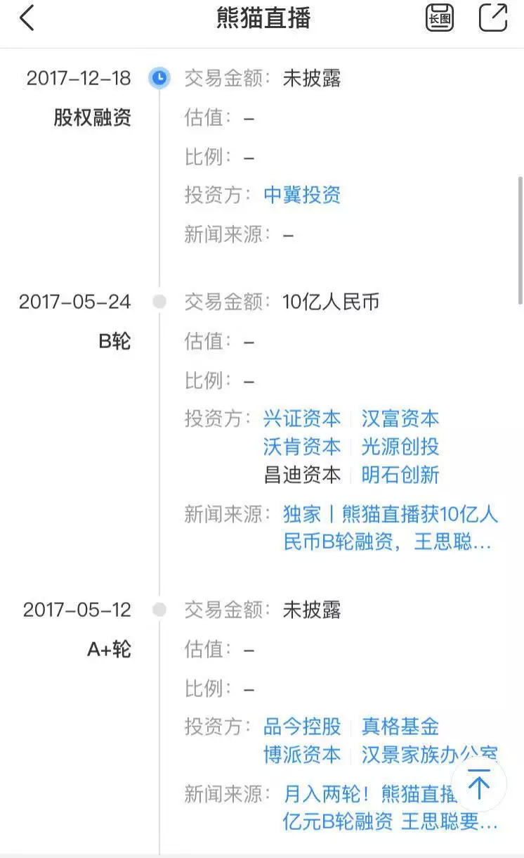 2015年王思聪成立熊猫直播,顶着中国首富之子光环,两年间熊猫直播经历7轮融资,A轮融资6.5亿,b轮融资达到10亿,估值达到50亿,投资方从乐视网、奇虎360到兴证资本等。