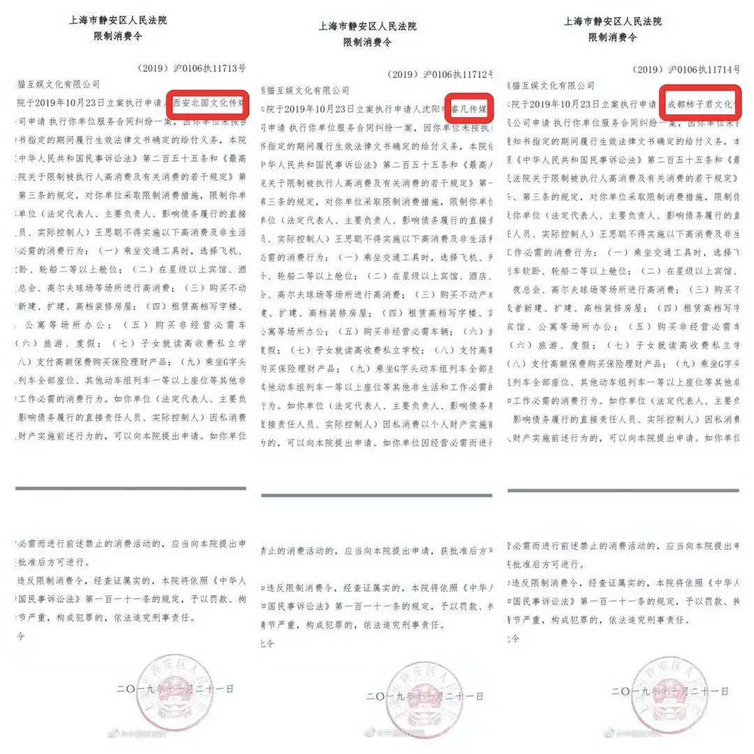 11月21日王思聪收到的三条限制消费令,分别来自沈阳市睿凡传媒有限公司(以下简称睿凡传媒)、西安北国文化传媒有限公司(以下简称北国文化)和成都柿子君文化传媒有限公司(以下简称柿子君文化)。