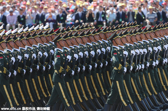 1. 2015年9月3日,中国人民抗日战争暨世界反法西斯战争胜利70周年纪念大会在北京隆重举行,女仪仗队员首次受阅。