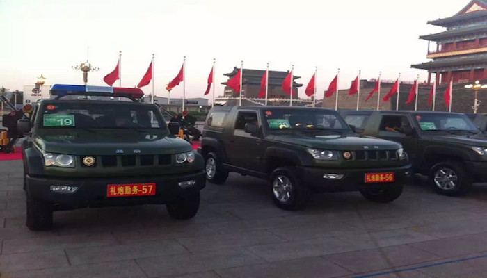 6. 礼炮牵引车:北京BJ40 此次阅兵仪式上,北京BJ40由1台引导车、1台压阵车以及56台牵引车,一共58台军绿色北京BJ40组成强大的阅兵牵引车方阵。北京BJ40全系搭载2.4L汽油发动机,最大功率105kW,峰值扭矩217Nm,非常耐用。