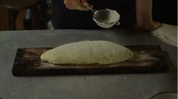 ◆ 发酵好后压扁,卷成长棍状,撒上干面粉,在表面斜着划几刀;