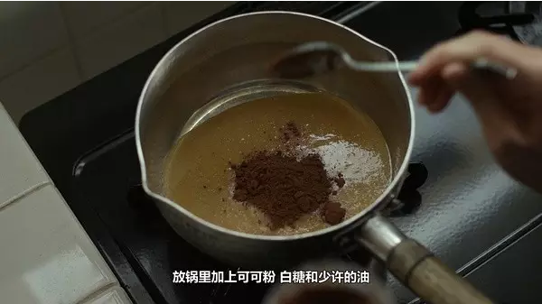 ◆ 倒入锅中开小火,加入可可粉、砂糖和少量油;