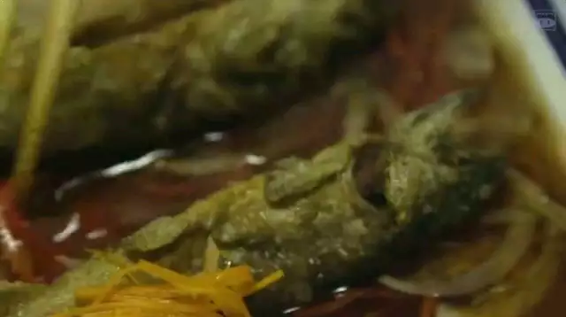 ◆ 准备汤汁:醋、砂糖、酱油混合之后加入干辣椒(电影中还加入三丝:胡萝卜洋葱和红辣椒丝)烧开;