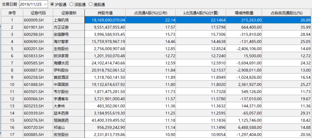 截至11月25日,外资A股流通股的占股比例越来越高。从沪市来看,以上海机场为最。